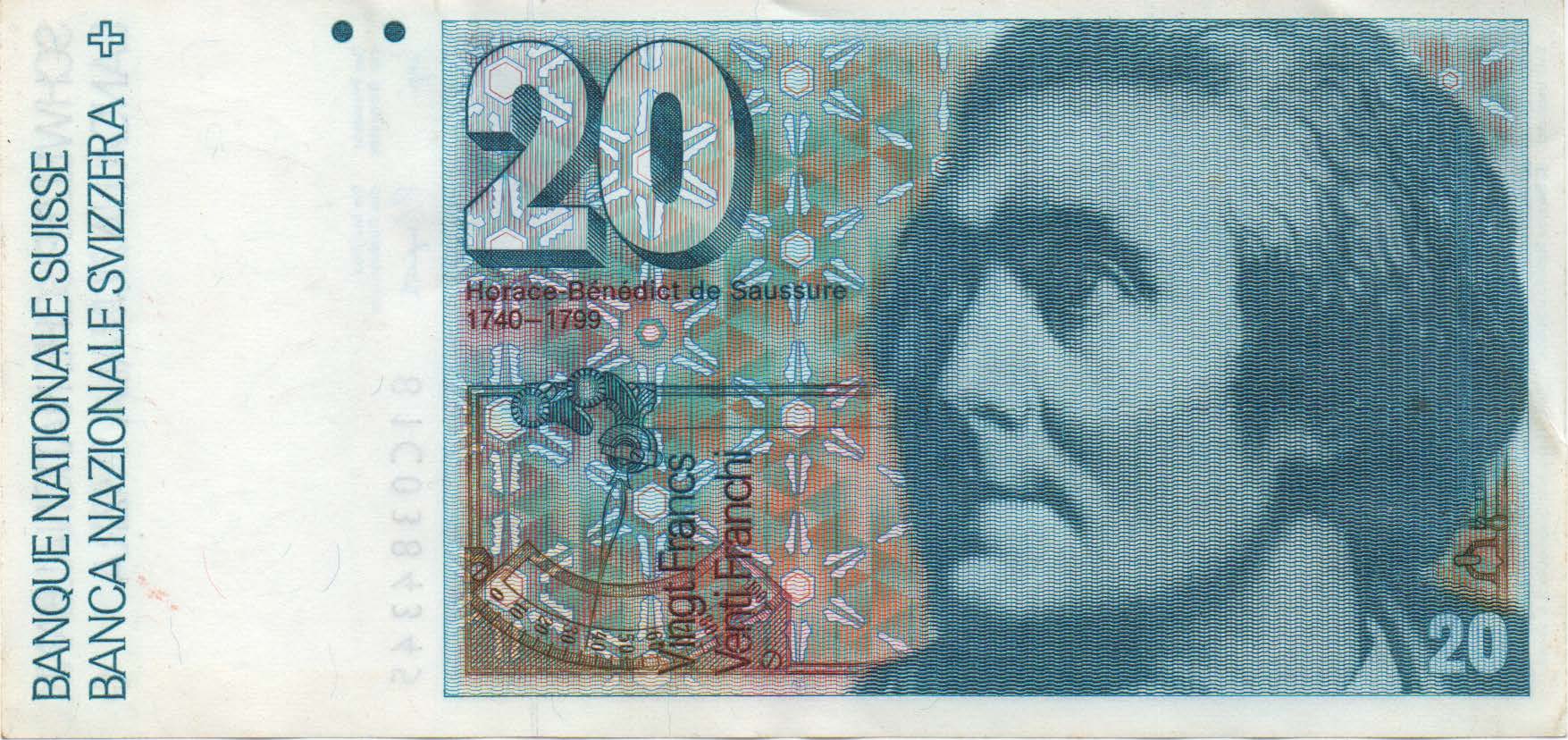 Switzerland 20 Francs – Horace Bénédict de Saussure, 1983 Χαρτονόμισμα Ελβετίας 20 φράγκα Ο Οράς-Μπενεντίκτ ντε Σωσύρ (Horace Bénédict de Saussure, 17 Φεβρουαρίου 1740 – 22 Ιανουαρίου 1799) ήταν γεωλόγος, μετεωρολόγος, φυσικός, ορειβάτης και εξερευνητής των Άλπεων από τη Γενεύη